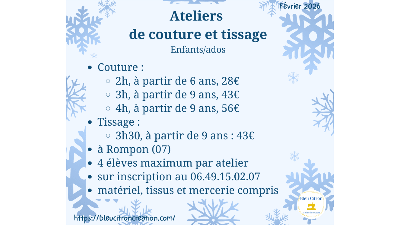 Tout au long de l’année scolaire, je propose des ateliers sur un thème précis (tour de cou douillet, trousse de toilettes, sac…) en partenariat avec la FJEP de Baix. Ces ateliers sont accessibles à tous, adultes et enfants à partir de 9 ans. Une cotisation annuelle de 15€/enfant et 25€/adulte est demandée par la FJEP.